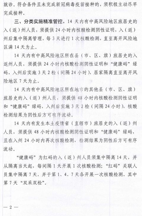14天内有发生本土疫情省(直辖市)旅居史的入(返)州人员,须提供48小时内核酸检测阴性证明和“健康码”绿码,且在入州24小时内再次核酸检测,检测结果为阴性后方可有序流动。